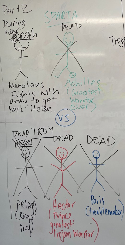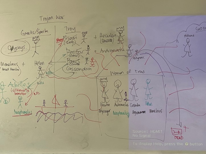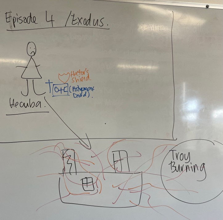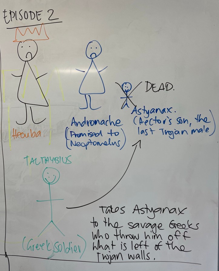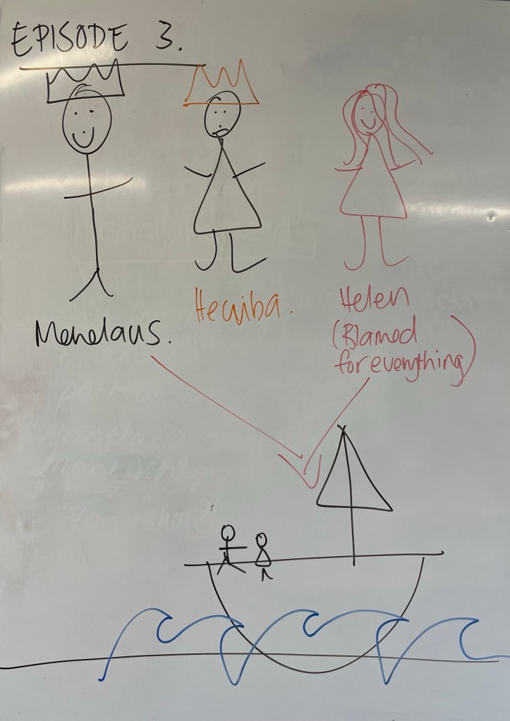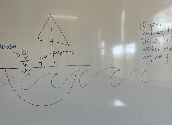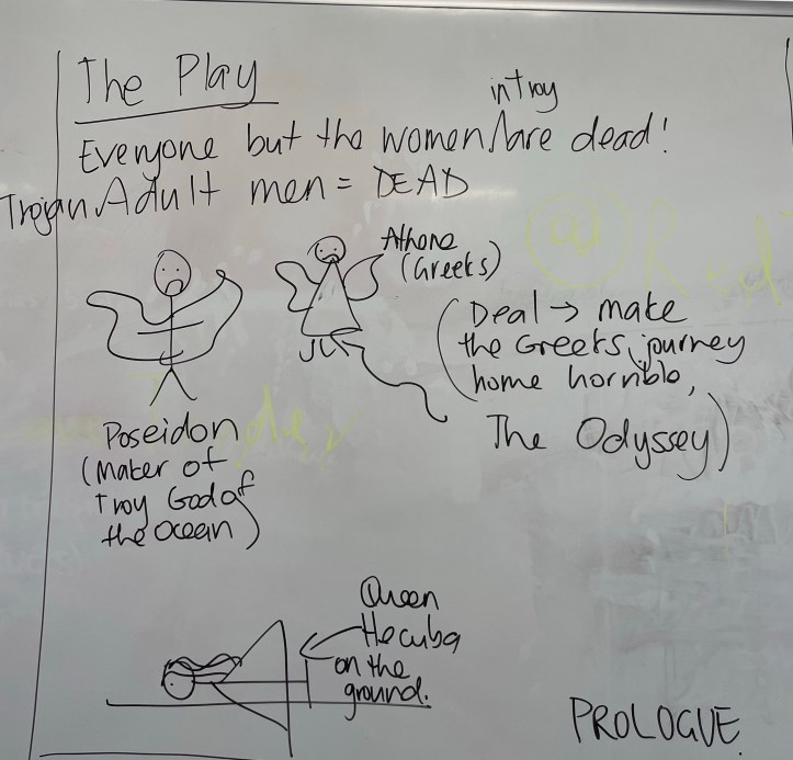 I’ve told you before that I’m not a very creative person. I can’t draw if my life depended on it, but last week I attempted to summarise Euripides’ play, ‘The Women of Troy’ to my Year 12s in the form of visuals. I will completely embarrass myself and include them in this summary to help you try and visualise what’s going on in the play, but going from the reaction received from my class, I think they may have some idea what’s going on and they’re hoping that I explain things in some more depth and without the drawings in the coming weeks. I’m also hoping that this summary will help them and anyone else studying the play to understand the basic plot of the play.