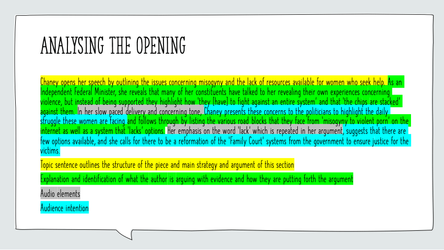 Before you read the sample writing, I just want to include a trigger warning. The content and issue are about gendered violence. The speech was delivered to the House of Representatives by Federal Minister Kate Chaney putting forth a motion for change to the laws and resources concerning gendered violence in Australia. She does mention an instance of violence towards a family member. If this in any way impacts you and upsets you, please do not read on. The samples that I have in my previous post on analysing argument are essentially the same except ignore the comparative component of the essay. I do not intend to cause any distress and therefore please do not continue to read if this will cause you any distress.