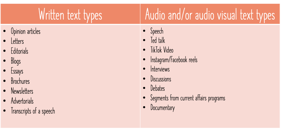 - Consider the specific form of the text (i.e. opinion article, editorial, letter, speech, TikTok reel, Instagram post) and how the elements of that specific form are used to enhance the author’s argument and position the audience to support the author’s intent.
