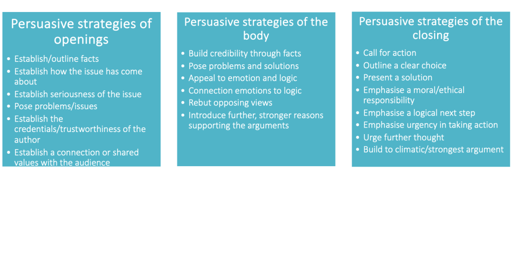 The old, old, old study design had students going through a persuasive piece looking to identify persuasive language. As teachers we made our students memorise and identify so many persuasive techniques and list as many as they could find in their responses.